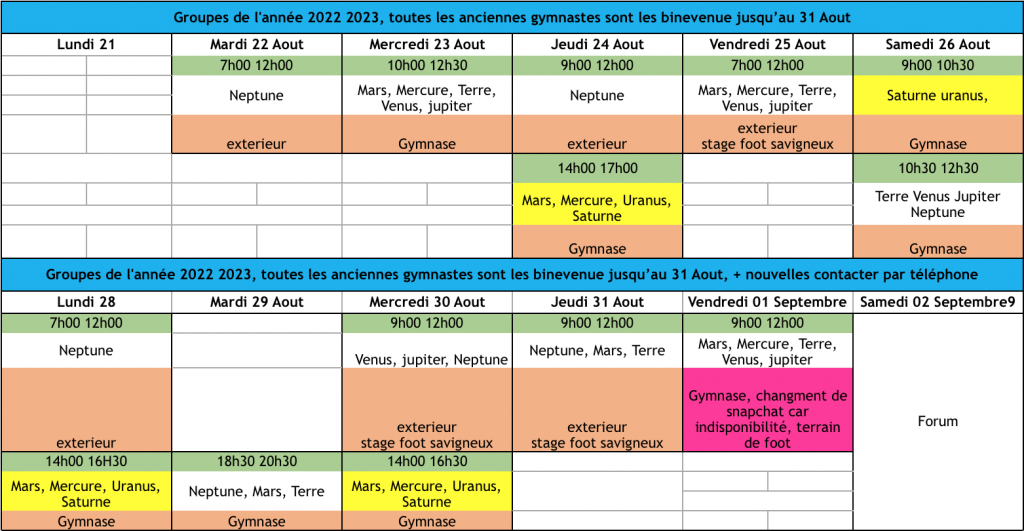 • Horaires d’entraînements