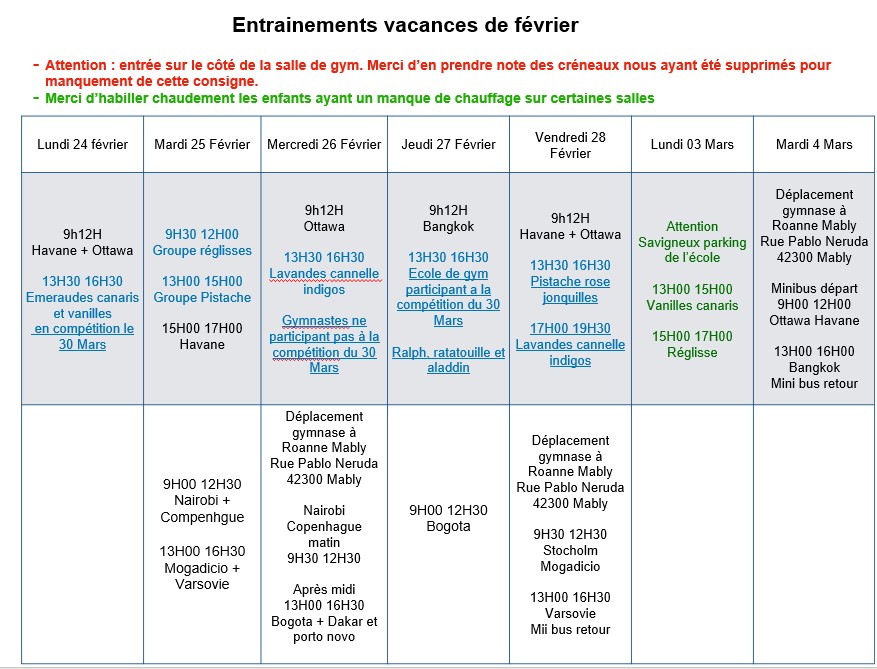 • Horaires d’entraînements